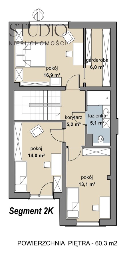 Piętro: trzy pokoje, korytarz, garderoba oraz duża łazienka z wc.