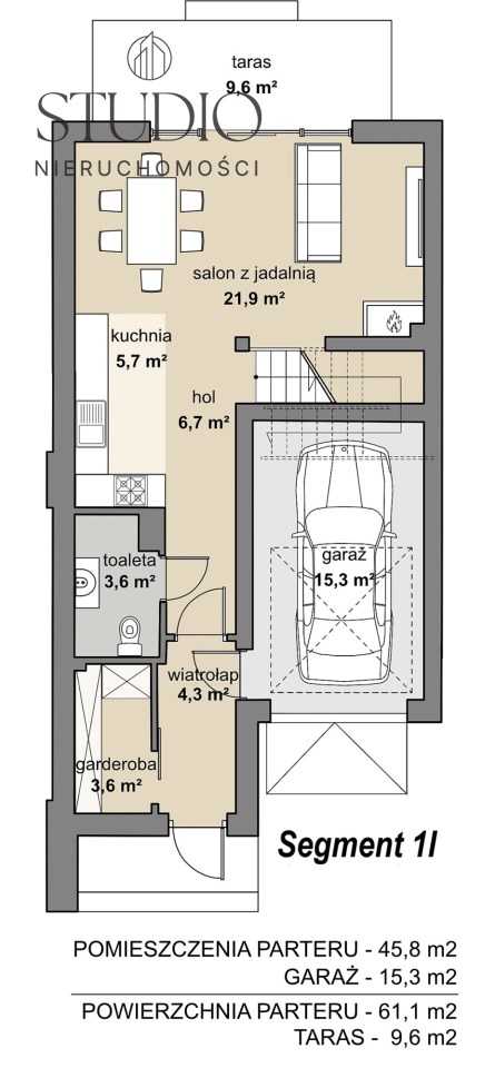 Salon z jadalnią, kuchnią i wyjściem na taras (10,3 m kw.), wiatrołap, garderoba, toaleta, hol oraz garaż.
