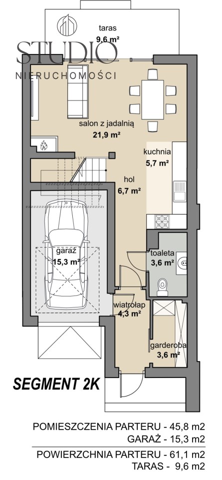 SEGMENT 2K POWIERZCHNIA CAŁKOWITA: 136,8 m2, POWIERZCHNIA UŻYTKOWA - 106,1 m2 , GARAŻ - 15,3 m2, POWIERZCHNIA DZIAŁKI - 243 m2, CENA: 780 000 zł