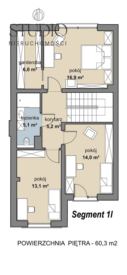 Piętro: trzy pokoje, korytarz, garderoba oraz duża łazienka z wc.